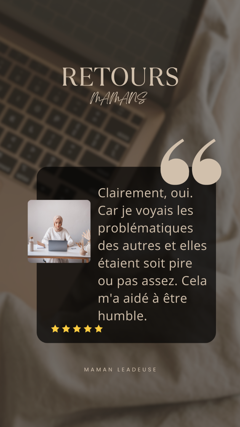 - Partage d'Expériences : Apprends de vraies histoires de réussite et découvre comment d'autres mamans surmontent des situations similaires.